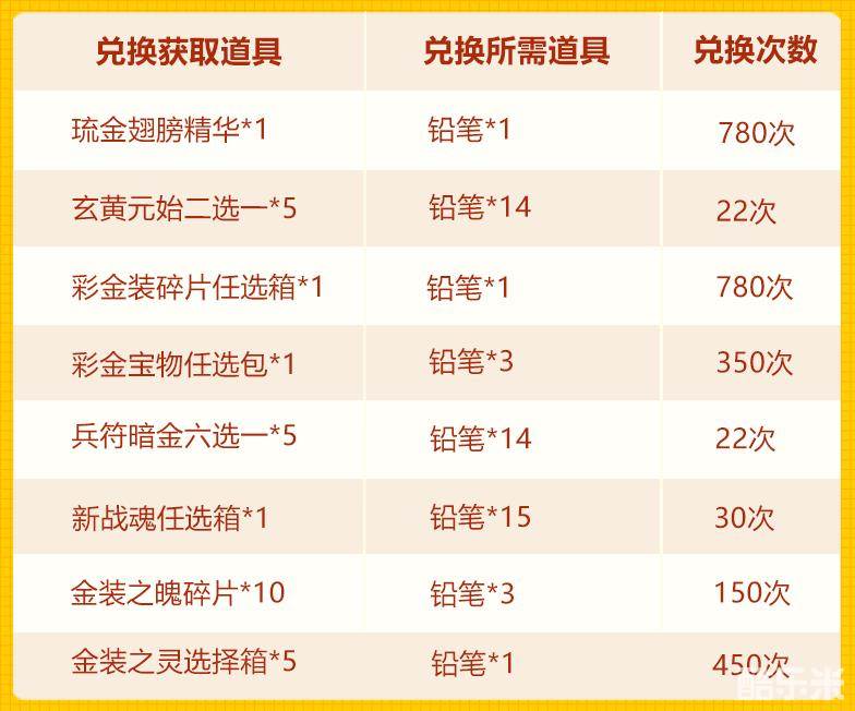 「铅笔」可用来兑换琉金翅膀精华、玄黄元始二选一、彩金装碎片任选箱、彩金宝物任选包等稀有资源:
