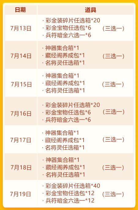 少年们能拿到丰厚的彩金装碎片任选箱、彩金宝物任选包、兵符暗金六选一、神器集合箱、藏经阁养成包、名将灵任选箱等资源哦~