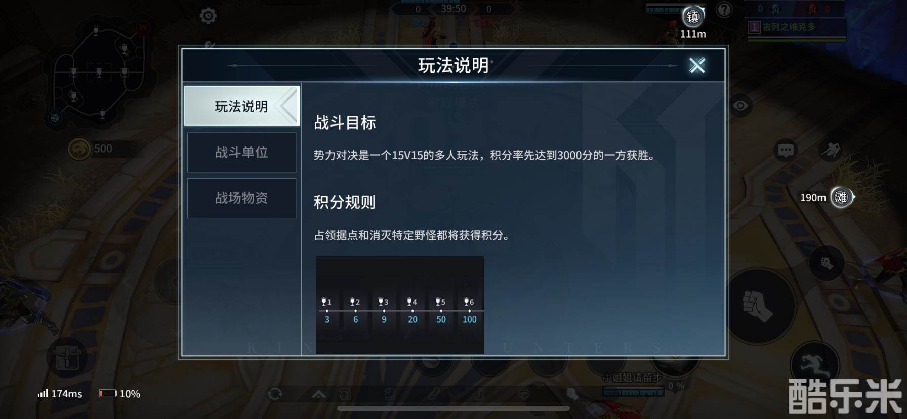 势力战作为《猎手之王》匠心独具的特色玩法,打造了一个两方势力针锋相对的多维战场。30名猎手到达战场,进行15V15决斗,累计积分率先达到3000或占满7个据点的一方获胜。积分可以通过占领据点和击杀特定野怪获得,因此这就要求指挥官在开局进行合理的谋划,保证团队力量集中攻打据点,在特定野怪刷新时也要第一时间召集队友去抢夺。