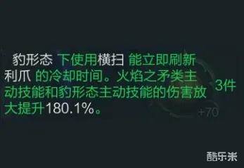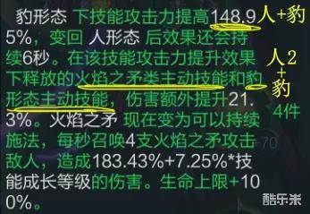 4件套:人+豹形态伤害放大 ↑148.95%,人2+豹形态伤害提升 ↑21.3%。豹子3个技能搭配着用CD很短,伤害又高,特别适合清怪。