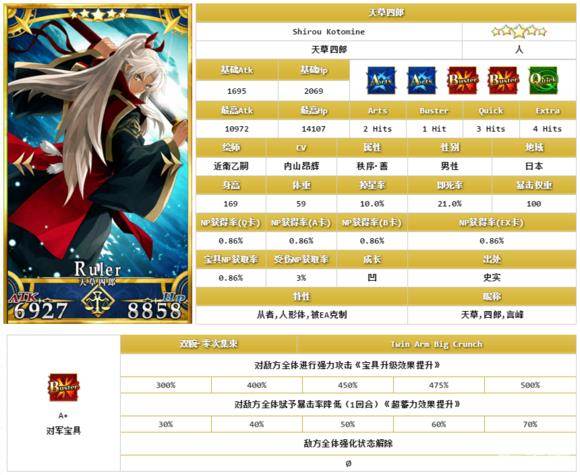 天草,说出来都是泪的英灵,技能很弱,没有伤害技能,也没有魔放,宝具群体攻击,伤害低,唯一优点是ruler阶职,很肉。总之很蛋疼的一个英灵