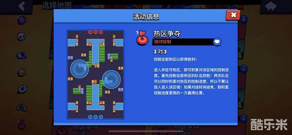 《荒野乱斗》全新主题季更新之后,游戏在原有几张常驻地图的基础上,新加入了全新的热区争夺模式。该模式的规则其实非常简单,双方谁先占据地图中的两个据点就能获得胜利,如果双方在规定时间内,没能完全占领据点,则据点占比多的一方获得胜利。