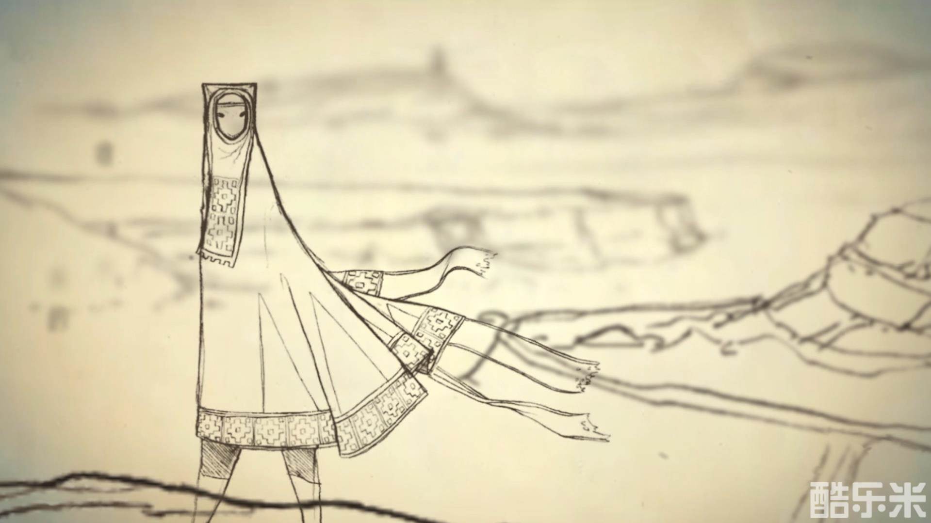 一条连贯的曲线,落成了绵延的山脉;一根流畅的直线,化为沙漠的无边;几笔交错的线条和看似信手涂抹的阴影,一位身着斗篷、飘带翩飞的旅人形象便跃然纸上……视频的开头,便是陈星汉手稿册的第一页,也是《风之旅人》设想最初的起点。