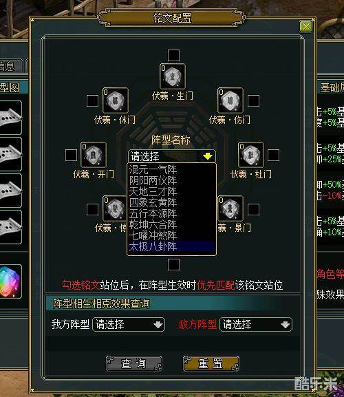 除了基础属性之外,伏羲铭文属性也是为阵法加成重要因素之一,如“混元一气阵”的铭文属性就是由开门、休门、生门、惊门、杜门的铭文属性组成。比如,“开门”的铭文属性就是在主动攻击时,有几率对主目标附带神圣之光效果;“休门”就是在主动攻击时,有几率无视主目标的闪避效果等。