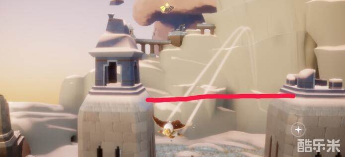 首先我们要知道,飞行赛道入口是有要求的,收集足够先祖后才能进入,如果没有收集够的可以直接从顶部飞入,我们只需要知道它限制的范围就行,我已经在途中标了,这个结界的范围就到这里,从上一个技巧开始就可以直接利用滑翔直接越过结界快速进入飞行图。