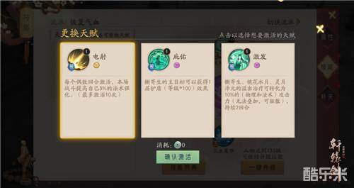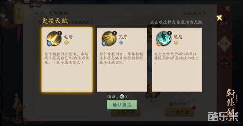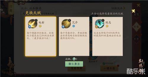 天师道:“电射”可在每个偶数回合获得提升,本场战斗永久提高法术强化;“咒序”在每个奇数回合,单体控制法术将忽略目标的控制抵抗数值;“绝息”可使角色在攻击生命低于40%的单位时提高基础法术攻击。