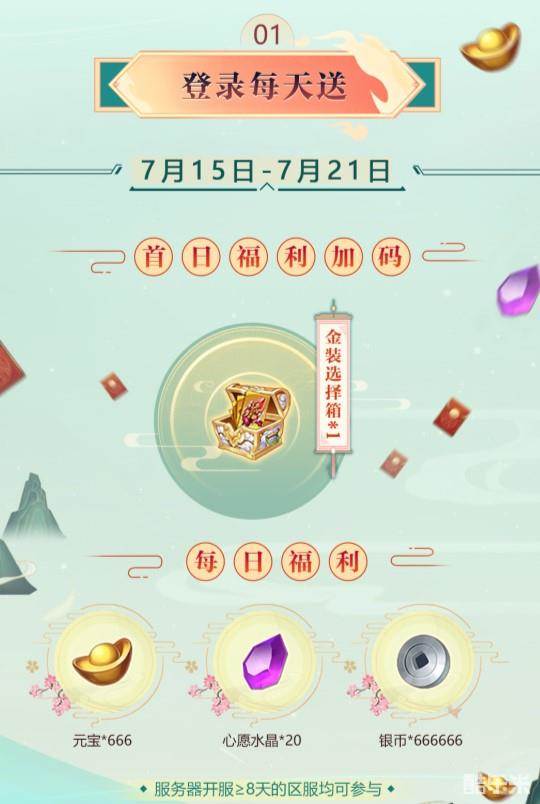 首先,少年们每日登陆游戏即可领取大量元宝、心愿水晶、银币奖励,而7月15日当天登陆游戏,更可直接获得金装选择箱*1的豪华大礼,开启可任选一件金色装备,实力大UP!