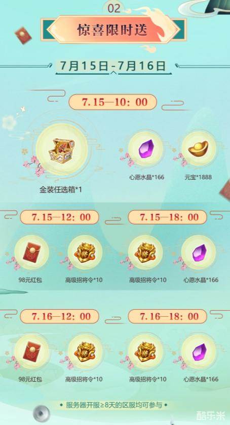 除了每日登陆福利,7月15日10点、12点、18点,以及7月16日的12点和18点,总计五个整点,《少年三国志2》还将开启“惊喜限时送”活动,98元红包、40武将连抽、心愿水晶在线即得,少年们切莫错过哦!