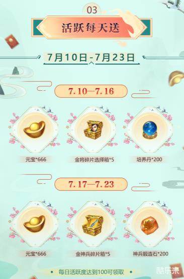 最后,7月10日-7月23日,少年们只需要每日完成活跃度达100分,就可在日常奖励之外,额外再获得元宝、金将碎片选择箱、金神兵碎片选择箱、神兵锻造石等珍稀资源奖励!