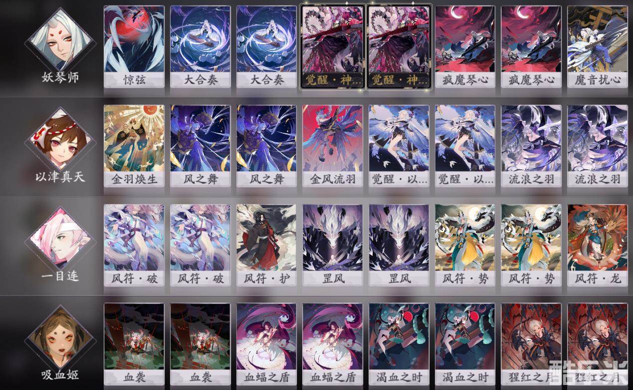 在第二套卡组中,吸血姬提供回复,额外增益等,是牌手安全存活到后期的重要保障;前期的一目连负责站场,中期给到过牌和鼓舞加成;妖琴师觉醒后,可以减少友方的倒计时,控制对手式神的气绝时间;以津真天是输出核心,前中期利用“黄金羽”压制对手生命值,后期利用形态打出群体伤害,增强后的战斗牌也有斩杀能力。因为有吸血姬“腥红之月”的存在,“黄金羽”也有吸血效果,前期生存能力并不羸弱。