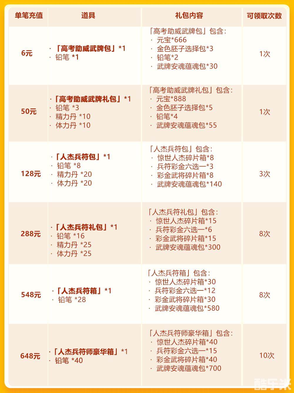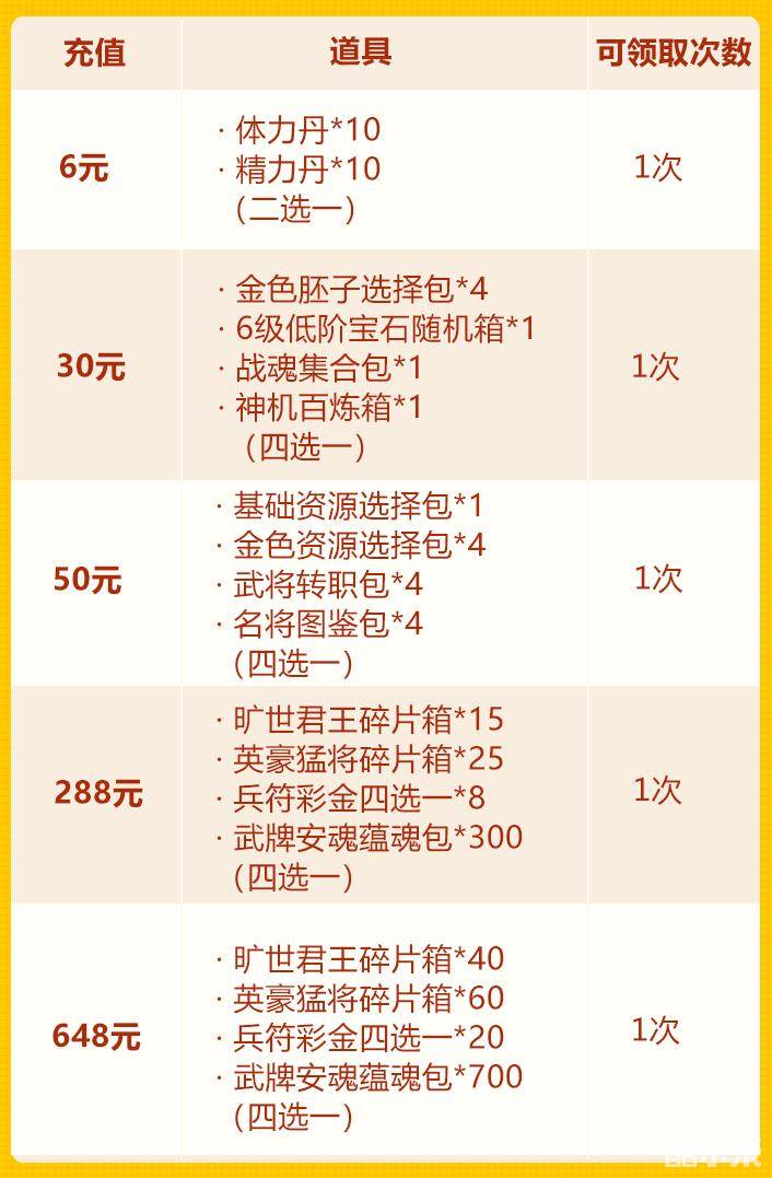 在活动期间少年们单笔充值至指定金额,即可获得惊世人杰碎片箱、兵符彩金六选一、彩金武将碎片箱、武牌安魂蕴魂包、铅笔等资源: