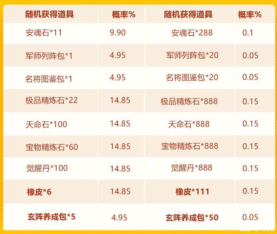3.「助威礼盒」可开出:橡皮*111、玄阵养成包*50、觉醒丹*888、天命石*888、极品精炼石*888、安魂石*666、军师列阵包*40、名将图鉴包*40、宝物精炼石*888、橡皮*6、玄阵养成包*5、觉醒丹*100、天命石*100、极品精炼石*22、安魂石*11、军师列阵包*1、名将图鉴包*1、宝物精炼石*60中的随机1种。