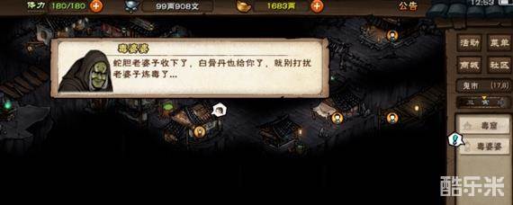 我们随后去药王谷找到药王通过对话来选白骨丹,不过很可惜需要找材料才能炼丹,随后去找毒婆婆来获取炼丹的线索,这个毒婆婆在鬼市场景的(17.8)这个位置,需要的材料有骨头*40、虎骨*20、鹿茸*5、人参*5,另外还需要十个蛇胆作为报酬。