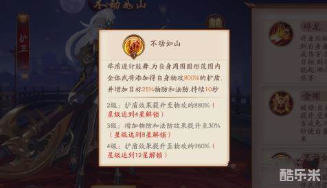 总的来说,不动如山的时装特色就是保护、控制、坦度、护盾,它有一个合格护卫武将的一切属性~~因为主角自身的基础面板就很高,所以不动如山的伤害也很可观。