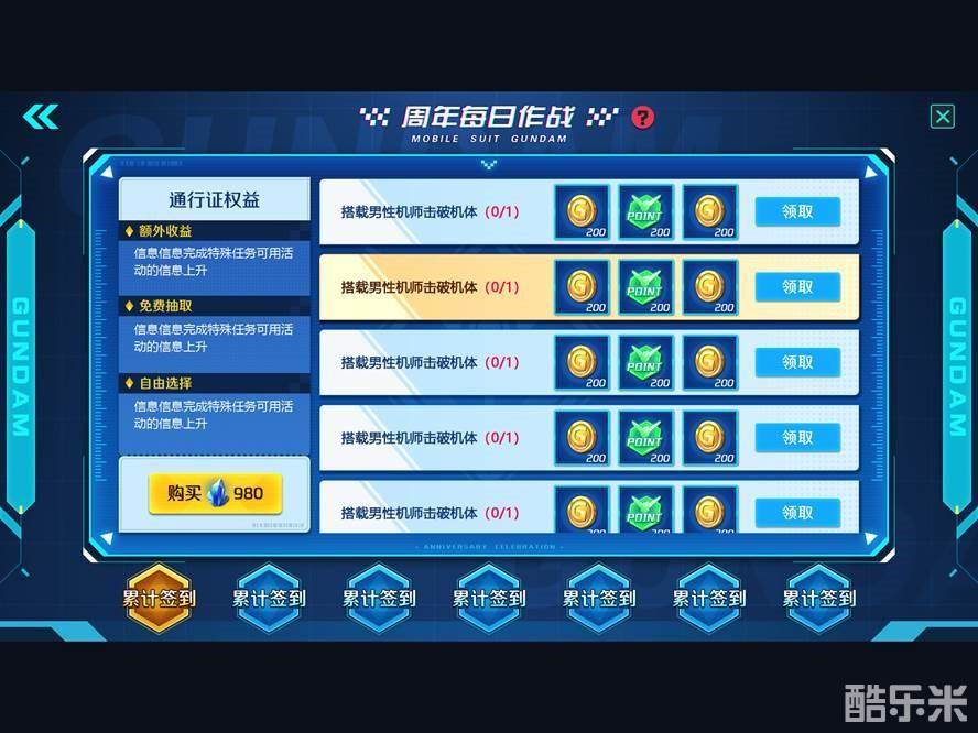 7月17日-8月13日活动期间,每日登录《敢达争锋对决》进入2.5周年特别纪念活动页面,可以领取累计签到奖励,同时活动期间每日会有指定任务等待玩家完成。通过签到和每日任务玩家可获得海量金币、点券、培养素材、高级设计图纸等奖励。