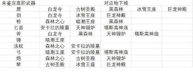 刷地下城还有一个主要的目的就是希望获得极品的底子,然后用于打造传奇武器,经常在群里能够看到很多萌新在问“xx武器底子在哪里刷呀?”之类的问题,今天就来盘点一下,不同的地下城分别对应的未鉴定高阶武器都是哪些。首先先感谢臭臭,咸鱼,芬达三位大佬友情提供的数据。