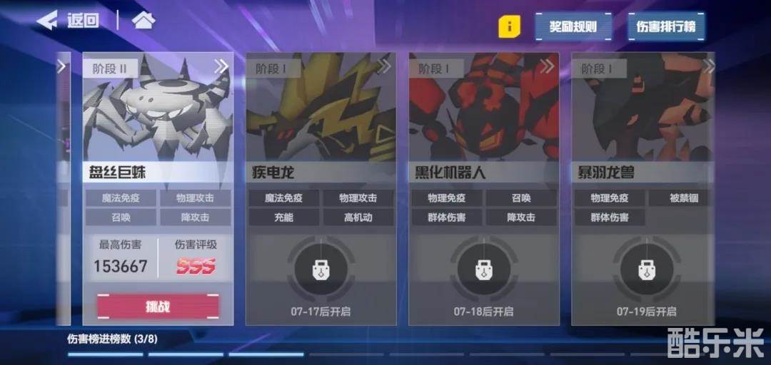 在本次的挑战中,除了中间一只大boss之外,两边与上方都各有一只不同属性的小boss。这些小boss会无限召唤小怪,召唤出的小怪必须全部清理完毕之后才会继续召唤,且小boss不会掉血。因此,合理的搭配群攻与单攻参赛者,也是一门功课哦!