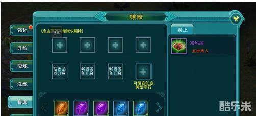 装备镶嵌是用来在装备上镶嵌宝石的。每个装备都有宝石孔,可以镶嵌各种等级的宝石,装备的强化等级越高,所拥有的宝石孔越多,最多可同时拥有4个宝石孔。