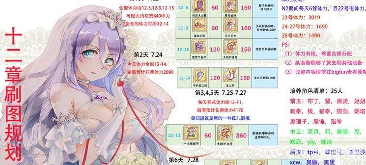 4、本次刷取方案依旧以工会战角色优先。若每天6管体力,加上前一天卡体力的话,是足够刷完这些角色的,请放心。