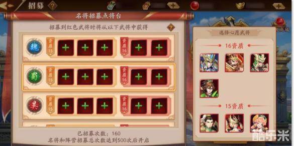 2.每个阵营可设置2个16资质心仪武将、3个15资质心仪武将;