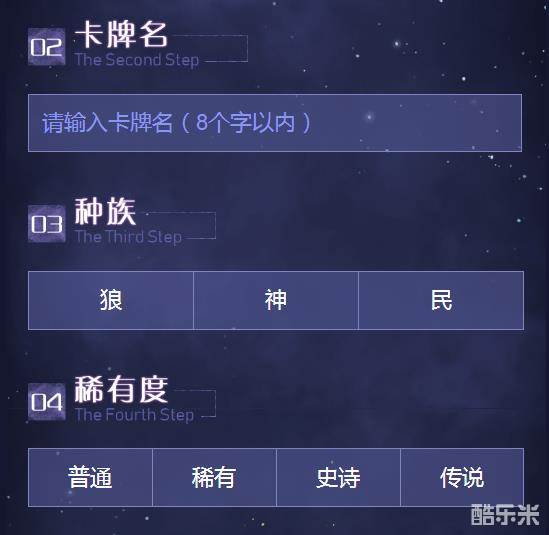 随后设置需要制作的卡牌名,并选择卡牌所属种族及卡牌的稀有度;