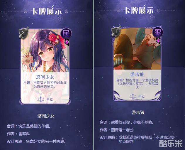 而策术师们的全新卡牌设计作品,展现出了强大的创作天赋,比如下面这张“悠闲少女”和“游击狼”,前者的技能设定很有趣,后者的名字放在《狼人对决》世界观中丝毫不会突兀。