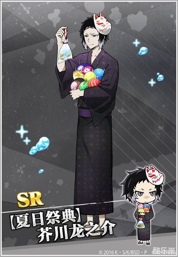 限定招募的另一张SR卡牌就是这张SR【夏日祭典】芥川龙之介啦,抱着团扇、拿着一袋金鱼的他似乎也是收获颇丰。喜欢争强好胜的芥川龙之介看来是很看重游戏的胜负了,在这个难得的休假,希望他也能好好放松一下吧。