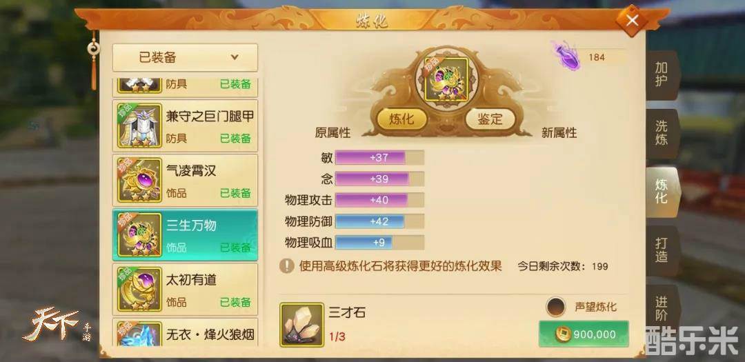 一转眼又到了《天下》手游装备大佬们的交流时间!天机大佬“xylen”率先拿出了他的“三生万物”90段项链,37点敏、39点念、40点物理攻击、42点物理防御的炼化数值相当优秀,第五条9点物理吸血的属性更是锦上添花,所谓“攻防兼备”也不过如此!