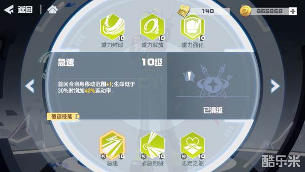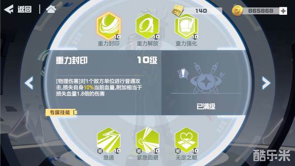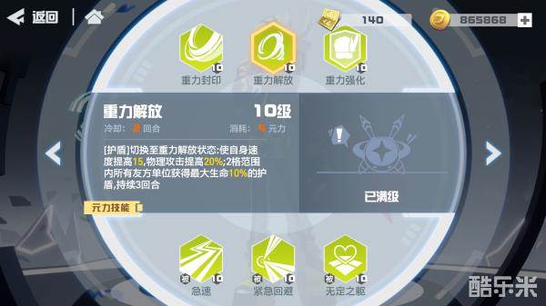 切换至重力解放状态:使自身速度提高15,物理攻击提高20%;2格范围内友方单位获得最大生命10%的护盾,持续三回合。