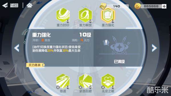 切换至重力强化状态:使自身受到的伤害降低20%并恢复30%最大生命。