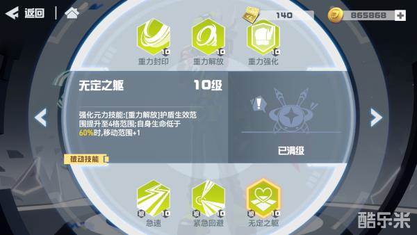 强化元力技能:[重力解放]护盾生效范围提升至4格范围;自身生命低于60%时,移动范围+1。