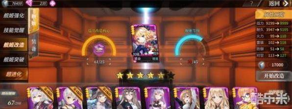 舰姬改造俗称升星改颜色,是提升舰姬战力的重要组成部分,舰姬改造需要到达对应的等级,改造需要消耗对应舰种的改造核心,改造星级越高消耗的核心数量越多,舰姬改造到金色可以解锁全部装备槽,是舰姬成长的一个巨大跨越点,所以我们要集中资源迅速将主力舰姬进行改造,以应对之后的推图和限时活动的挑战。