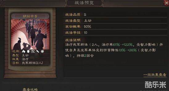 战法分析:50%的发动几率保证其治疗及减伤的稳定性,配合御敌屏障与暂避其锋等减伤战法,可以使队伍的最大叠加减伤达到90%以上,接近无伤。在保证前几回合战损极少的情况下,稳定输出对手,使敌人后继无力从而克敌制胜。