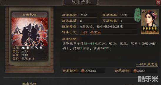 战法分析:极强的软控战法,偷取敌军四维属性38点,相当于降低了地方武将20级的等级,提升了自身20级,还能叠加两次,55%的发动概率,平均每两回合发动一次,诸葛亮最喜欢的战法。