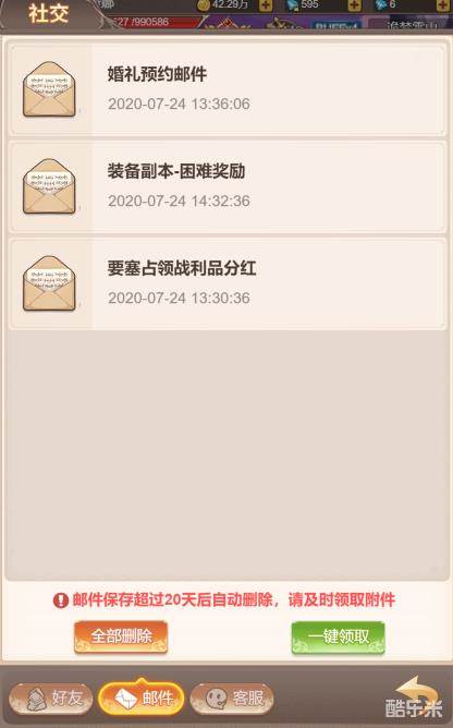 1.社交系统一共包括了好友、邮件、客服系统,在好友里有添加删除拉黑三个选项,邮件主要是用来收取系统奖励和公告的地方。