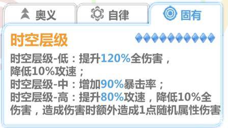 ⑤使魔【普洛姆特·午夜狂欢】的固有:时空层级-高【造成伤害时额外造成1点随机属性伤害】,将其固有固定在高层级(在释放奥义的时候出现表盘,提前手动将层级确认在粉红色上后,固有后续就固定在高层级)。