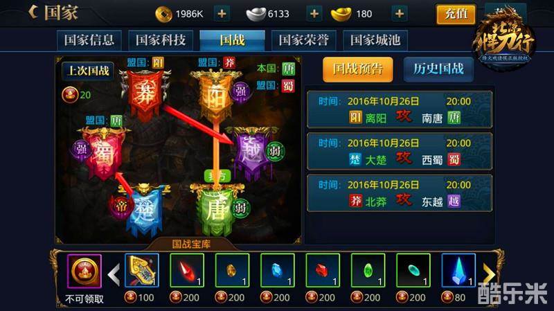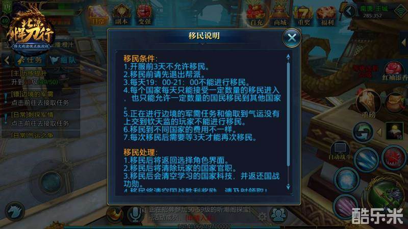 俗话说君子不立危墙之下,如果不能扭转国家命运,那就去试着转国吧。你只需要在本国王城找到移民官,就可以进行转国。但开服前三天是不允许转国的,每天的19.00-21:00帮战和国战期间也不能转国,在转国前,你需要先完成自己的气运任务、镖车任务、刺探任务,成功则会清空在本国的国战奖励。当然,转国是需要一定代价的,转入强国可能几万银子,而弱国只需要几千银子就可以了。当在本国待的不如意,不如尝试转个国家转个心情吧!