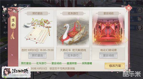 宴会玩法在游戏中分为筹备阶段与举行阶段。筹备共细分为五个阶段:预约时间——游行路线——租用场地——邀请宾客——采购喜糖,阁下可自由选择适合自己的宴会形式。说到宴会,那自然是少不了众多宾客的,阁下可与自己的挚爱一共选择参与活动的亲友,共同见证你们的甜蜜时刻。