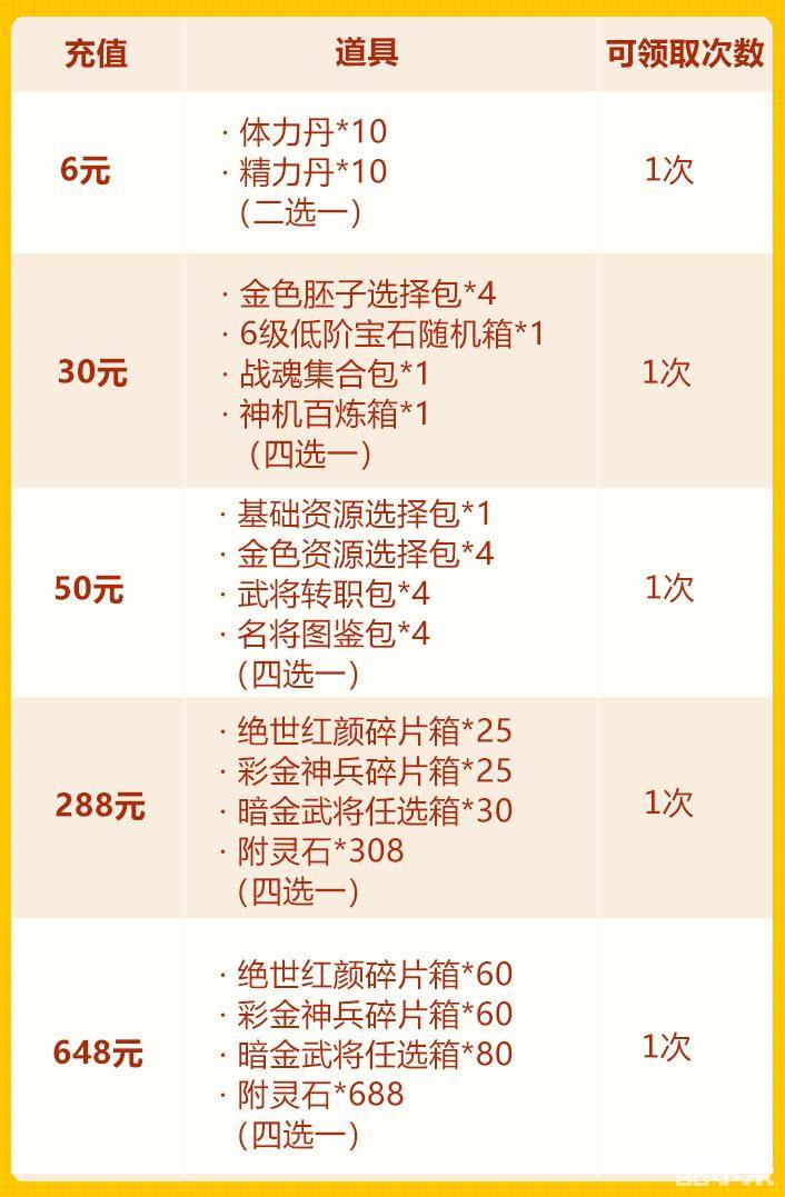 少年们单笔充值指定金额,即可得到绝世红颜碎片箱、彩金神兵碎片箱、暗金武将任选箱、附灵石等珍稀道具!并且可以和欢庆佳节中的充值活动叠加,千万不要错过哟~