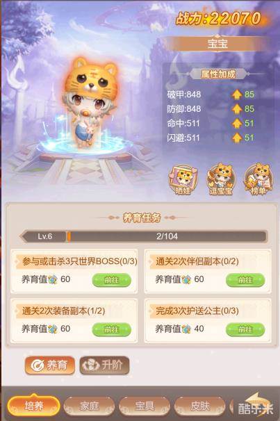 3)宝宝升阶消耗相应的材料获得经验值,经验值提升后即可获得更强的属性加成