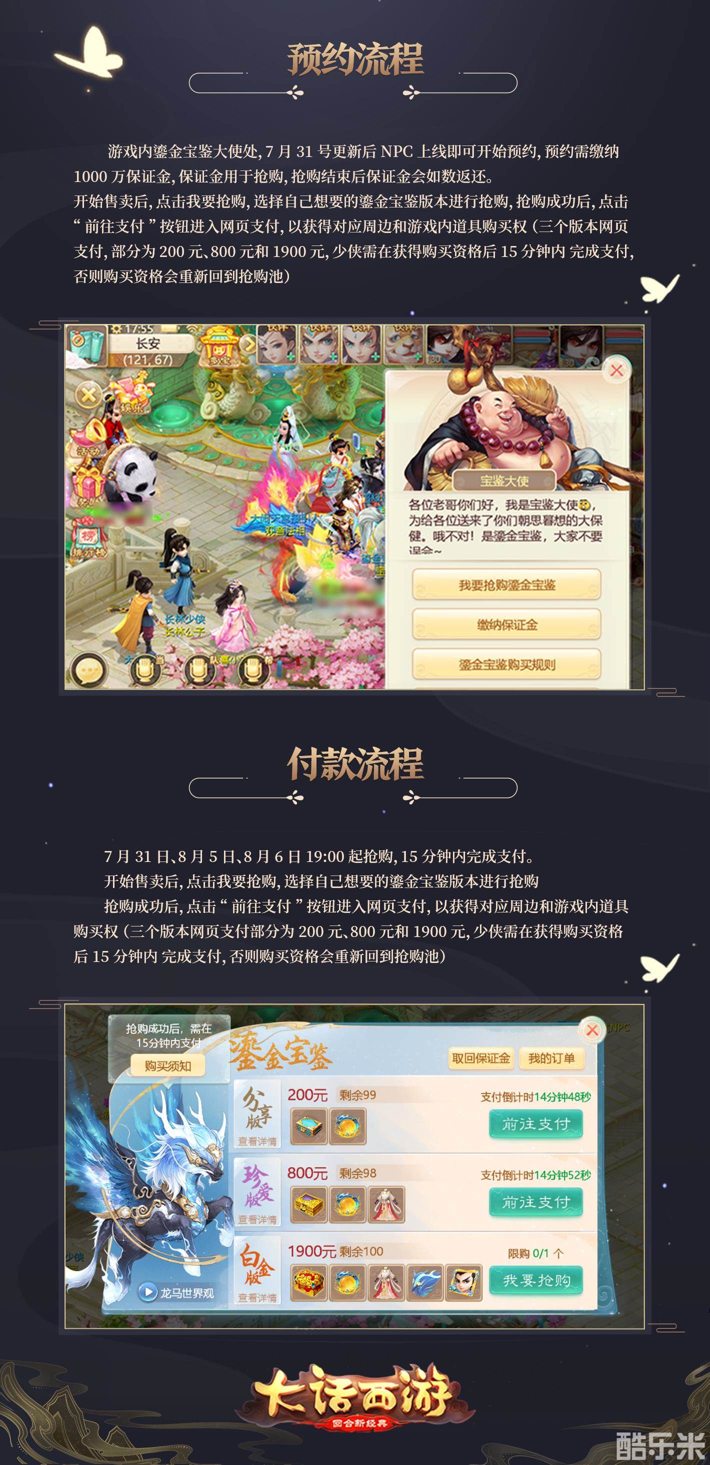 为了保证售卖期间的公平公正,让更多真心希望收藏鎏金宝鉴的玩家都能得偿所愿,今年的所有版本鎏金宝鉴都将分实物周边+游戏内道具两部分进行发售。玩家在正式售卖开启前,需要在游戏中前往游戏内NPC鎏金宝鉴大使处,缴纳1000万保证金预约抢购资格,并在售卖开启后,前往购买页面选择自己想要的鎏金宝鉴版本并点击抢购,于15分钟内完成支付后,回到购买页面继续进行游戏内道具的支付,即可完成全部的购买流程。具体购买流程如下: