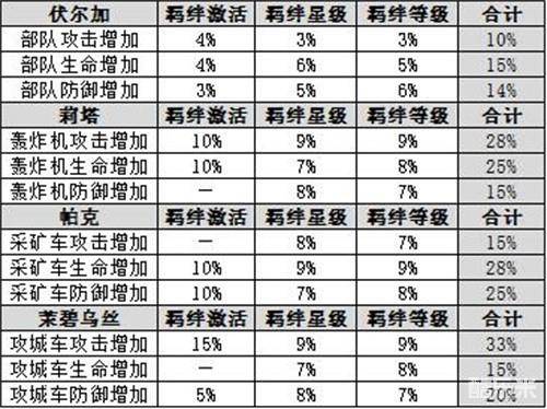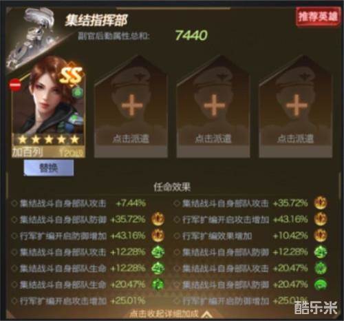 以上数据中,加百列任命在集结指挥部时,对自身部队攻击和防御的加成,均超过了100%,生命加成也接近30%,属性提升相当大。