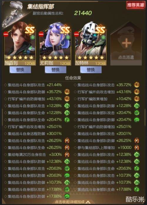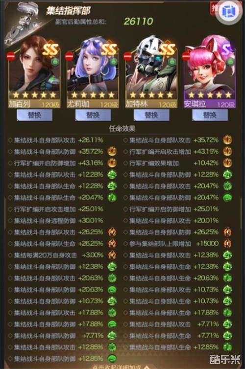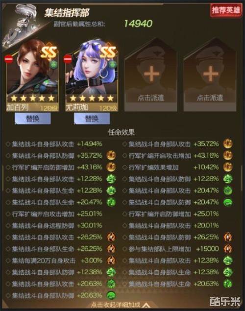 集结指挥部最高可以有四个任命位置,加百列和尤莉珈自然是任命的首选,除了她们以外,在前期的委任英雄介绍中,对各后勤英雄的任命加成,已经有了详细的数据分析,今天,我们就把加成最高的任命效果,直接分享出来。