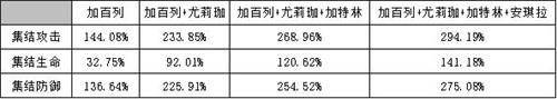 从上到下依次为:集结指挥部无任命,集结指挥部任命加百列,集结指挥部任命加百列并开启“行军扩编”技能。属性增加数据如下表: