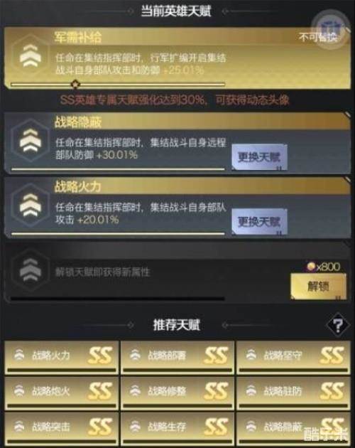 除了芯片和任命,加百列的最重要的属性提升就是来自于英雄天赋啦。加百列的自身第一条专属天赋是“军需补给”,同样是在使用“行军扩编”战略技能时,增加自身部队攻击和防御,满天赋时最高可获得25%的加成。推荐的天赋共有9种之多,小雅为大家总结如下: