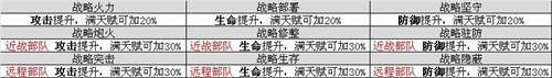 第一行是全兵种的三围属性提升,第二行为近战部队、第三行为远程部队的属性提升;第一列都是攻击加成、第二列都是生命加成、第三列均为防御加成。这样看起来,是不是直观很多呢?9条天赋均为SS级,为玩家提供了大量的选择空间。如果是专玩某一兵种的指挥官,可以挑战战略力搭配某一近战或远程的攻击、生命天赋,如果是全兵种大佬,可以选三条攻击天赋加成,满足不同玩家的不同需求。