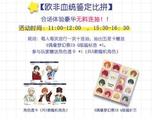 现场不止可以体验无限抽卡的快感,抽出五星卡还可获得《偶像梦幻祭2》的珍贵周边!Q版鼠标垫、角色透卡求抱走。立刻检验你的欧非血统吧!