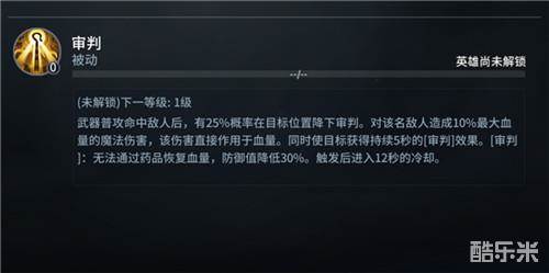 被动技能-【审判】:在击中敌人后,有一定概率触发被动,直接无视敌人护甲并造成伤害,同时附加无法通过药品恢复血量的负面效果和降低防御值。