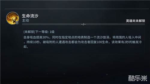 大招-【生命流沙】:提高自身吸血能力,同时制造流沙旋涡将周围敌人吸入,而被吸附者遭遇攻击会为攻击者回复100生命。