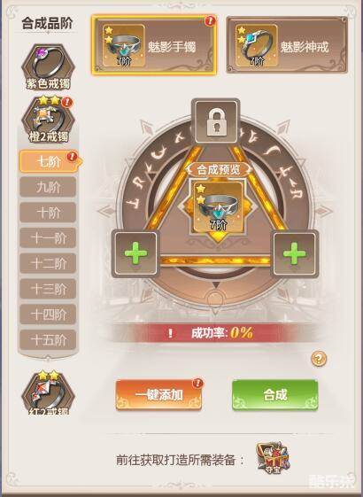 1消耗1件7阶橙色一星戒指(手镯)和1件指定阶数的橙色一星戒指(手镯)可100%合成出指定阶数的橙色二星戒指(手镯)。